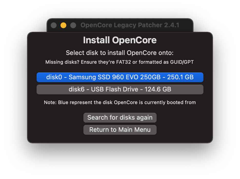 Sulla schermata principale di OpenCore Legacy Patcher clicchiamo su Build And Install OpenCoreInstall to disk -> selezionare poi il dispositivo USB da utilizzare, ripeto l’USB non l’hard disk del MAC(per ora).